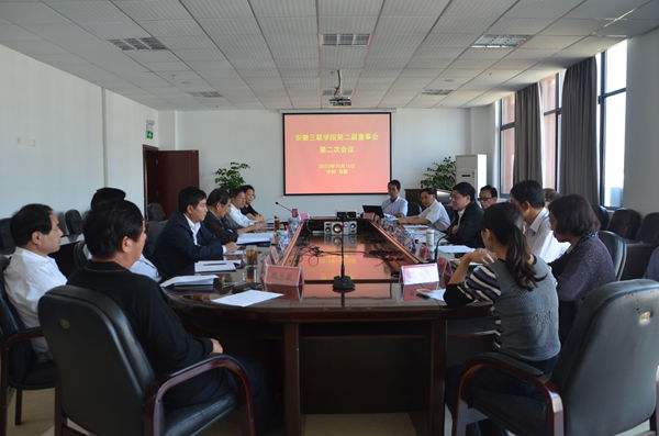 安徽三联学院第二届董事会第二次会议,于2013年10月10日11:00在学院图书馆T518会议室召开。余皖生董事长主持会议。学院第一届监事会监事、学院举办者安徽三联投资集团人力资源总监、学院非董事会成员的党政领导列席会议。