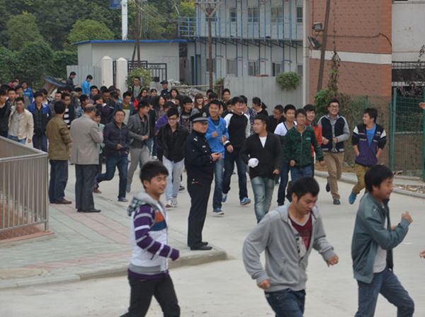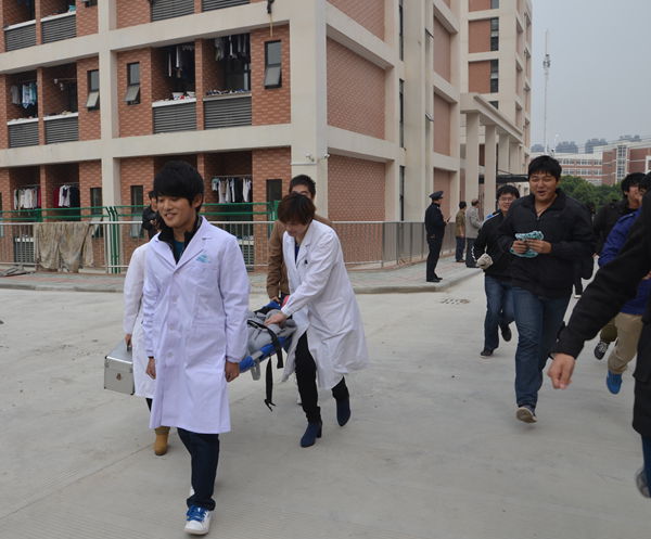 中午12时45分,各系(院)学管副主任及辅导员、宿管员、保安、校卫队等工作人员均到达指定岗位,随着鞭炮声和警报声的骤然响起,七千多名学生在辅导员、宿管员的引导下,全部按照指定路线,快速、有序地从各宿舍楼疏散至指定地点,整个演练过程用时2分55秒,紧张有秩,迅速而不慌乱,人多而不拥挤,演练完全根据实战要求,取得安全疏散效果。
