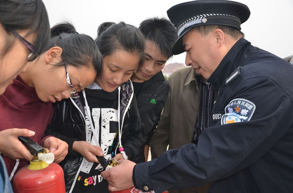在随后的消防灭火演练阶段,肥西县公安局桃花派出所张宁警官向同学们讲解了灭火器的构造及使用方法,教大家正确使用灭火器。来自各系(院)32名学生代表和2名宿舍管理人员积极动手,切身体验,分组进行了灭火演练。