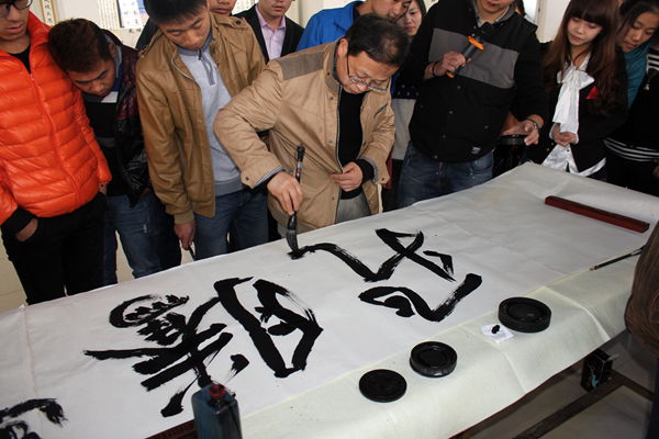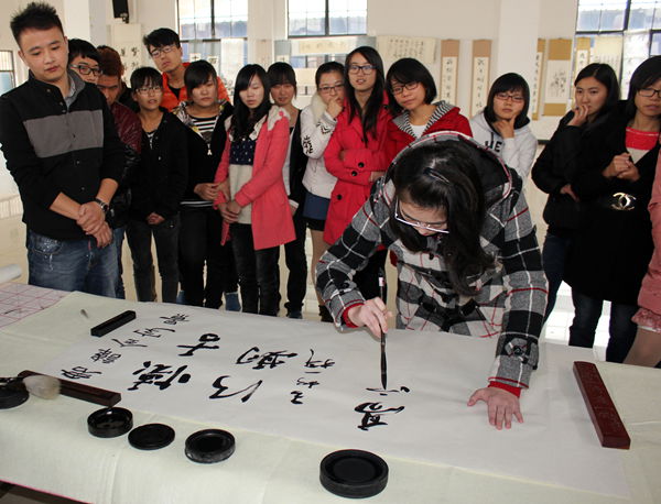 11月28日,在图书馆一楼大厅展览期间,省大中专就业指导中心主任鲍勇、省教育厅学生处处长左其琨,院党委书记桂宁东、常务副院长易佑民等院领导一同前往观看,并对我院学生的书画功底表示赞赏。(周新)