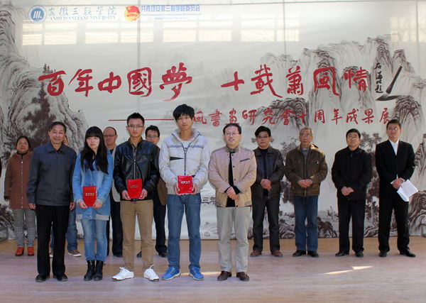“百年中国梦 十载萧风情”,11月26日,安徽三联学院萧风书画研究会成立十周年成果展开幕仪式在大学生活动中心举行。党委副书记赵延铸出席开幕式并宣布成果展开幕,著名书法家、中国书法家协会会员、省书法家协会内务部主任、省书法家协会楷书委员会秘书长石海松出席开幕式并受邀担任萧风书画研究会名誉会长,院长助理操晓峰,部分处(室)、系(院)领导参加开幕仪式。开幕式由院团委书记占海文主持。