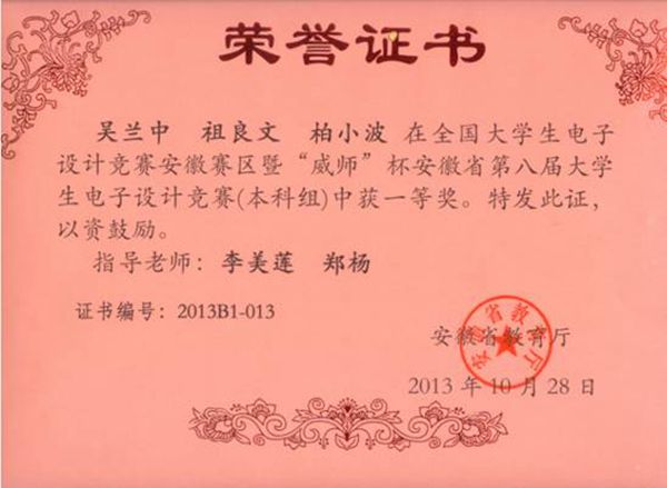 我院2010级电子信息工程、电子科学与技术本科专业柏小波、吴兰中、祖良文3名同学荣获2013年全国大学生电子设计竞赛安徽赛区一等奖,本届电子竞赛于9月3日至10月18日在全国30个省(市、自治区)同时进行,我院组建了五支队伍参赛,除一等奖外,其它四支队伍分获安徽赛区三等奖和优胜奖。