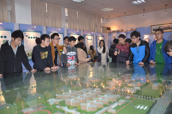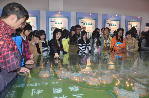 在讲解员的解说下,学生代表对学院的概况、办学定位、办学特色等有了更清晰的认识。参观同学更是驻足沙盘前,了解学院的整体规划布局,热切找寻自己的宿舍楼、教学楼。活动现场气氛热烈。