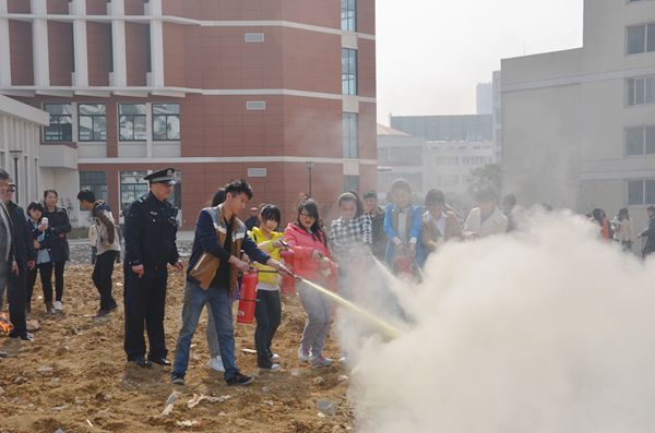 在随后的消防灭火演练阶段,肥西县公安局桃花派出所张宁警官向同学们详细讲解了灭火器的构造及使用方法。来自各系(院)54名学生代表和9名辅导员切身体验,分组进行了灭火演练。