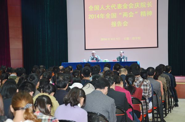 4月1日,我院在图书馆多功能报告厅隆重举行传达学习2014年全国“两会”精神报告会。十二届全国人大代表、我院院长金会庆教授作学习传达报告。省教育督导专员、院党委书记桂宁东主持会议。在肥院党政领导,全院科级及以上干部,各党总支、党支部书记,师生代表500余人参加了报告会。