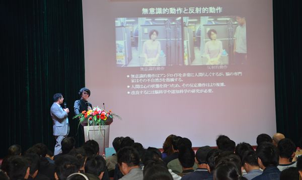 报告会吸引了500余名师生到场聆听,金院长的开场致辞更是让大家对报告充满了期待。随着大屏幕上仿石黑浩本人的机器人Geminoid HI-1和一款面带微笑的女性机器人Geminoid F的出现,他们双眸灵动有神、表情栩栩如生,石黑浩教授的报告开场就将大家带入了一场科技的饕餮盛宴。石教授紧接着展示的一款趋于卡通设计的遥控机器人Telenoid,人们可以通过它来传达自己的声音、表情和动作,让远在他方的亲人能感觉与真实的自己在交流,更是让到场师生惊叹不已,无不体验到当今科技的无穷魅力。石黑浩教授同时表示,要建造更加人性化的机器人,必须研究认知科学、神经科学、心理学以及社会学,只有把这些不同的研究领域整合在一起,才能促使人与机器人建立更好的关系,尤其是人形机器人。石教授的报告内容丰富、信息前沿、引人入胜,原定一个半小时的报告会不知不觉就近尾声,广大师生意犹未尽,抓住最后的互动环节,纷纷就感兴趣的机器人制作中的一些技术性问题和机器人未来发展方向等进行提问,石黑浩教授也是耐心释疑,现场气氛活跃。石教授渊博的学识、谦虚的态度赢得到场师生的阵阵掌声。