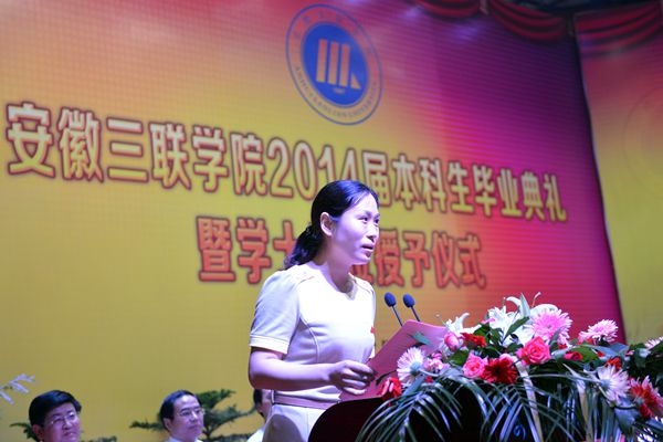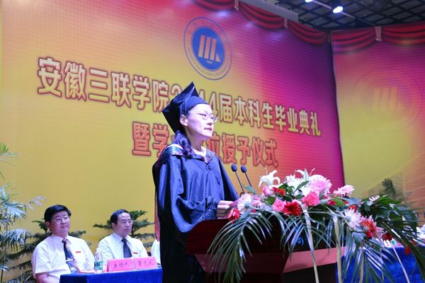 商学院陈红梅同学代表全体本科毕业生发言,她满怀感情地回忆了在三联的点点滴滴,回顾了丰富多彩的大学生活,表达了对同学友谊的不舍,对老师教育的感激,对母校的深深眷恋,并代表全体毕业生祝福母校的明天更加强大。
