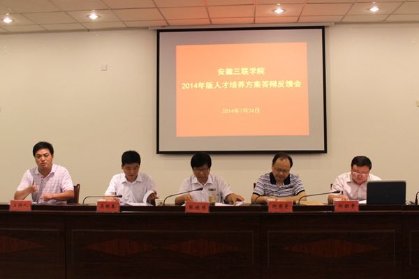 7月24日上午,我校召开2014年版人才培养方案答辩会。常务副校长金美莲、副校长张树林出席会议,会议邀请铜陵学院副校长倪国爱教授、合肥师范学院副校长吴昕春教授、滁州学院副校长郑朝贵教授、皖西学院副校长张穗萌教授等十位校内外专家组成答辩委员会。评建办(质管办)、就业实训处、团委主要负责人,各二级学院院长、分管教学副院长、系主任(含教研室主任)、方案起草人、学科带头人(含培养对象),教务处相关人员参加会议。会议由副校长姜发根主持。