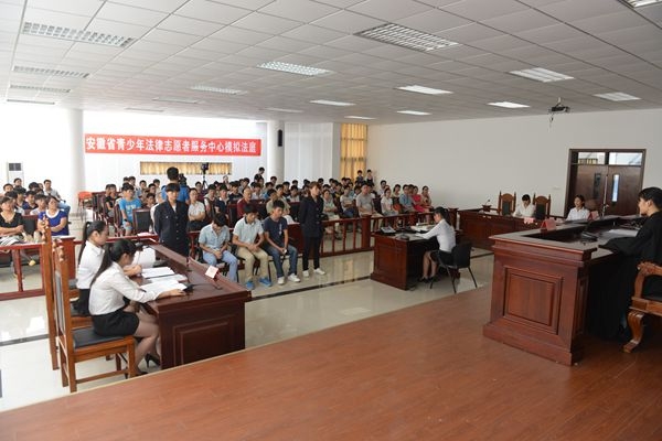 近日,由安徽省青少年法律志愿者服务中心举办的首次模拟法庭活动敲响法槌。校长金会庆教授亲临观看并在“庭审”结束后与志愿者合影留念。校监事会主席朱熔、校党委书记鲁先长、副校长姜发根,人文经济学院、校团委负责人及部分教师,以及近百名在校学生参加了庭审观摩。
