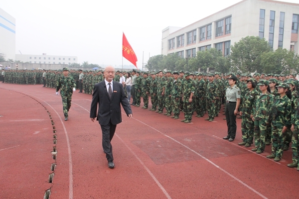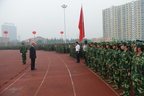 在军训成果汇报前,金会庆校长检阅了新生方阵。金校长步行从一列列方阵前方走过,看着英姿飒爽的新生,经过半个多月的军训生活,他们褪去了初入校时的迷茫和生怯,金校长深感欣慰。