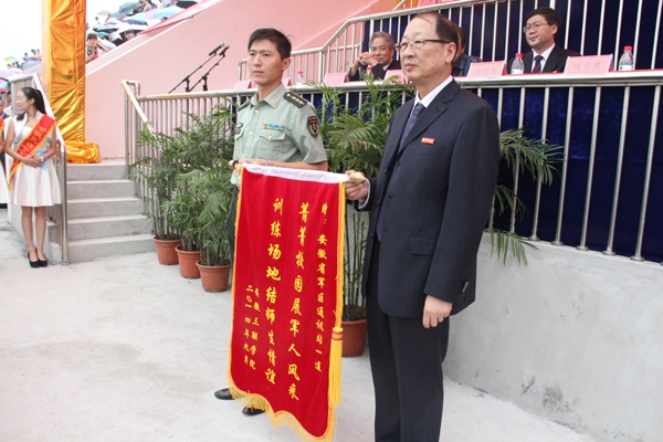 校党委书记桂宁东向安徽省军区通讯站一连的首长赠送锦旗。