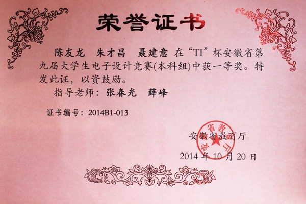 11月8日,2014年“TI杯”安徽省第九届大学生电子设计竞赛总结暨颁奖大会在安徽工程大学举行,我校电子电气工程学院组建的三支代表队分别获得本科组一等奖、二等奖、三等奖的优异成绩。其中朱才昌、陈友龙、聂建意三人小组荣获电磁类安徽省一等奖。