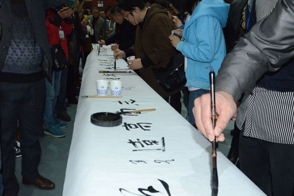 报告会上,10位书法家现场书写书法长卷,他们泼墨挥笔,张弛有度,一笔一捺都彰显出书法的力量,观众们围满了整个长桌,淡淡的墨香萦绕着整个会场。随后,我校萧风书画研究会成员带着书法长卷与嘉宾、老师和同学们合影留恋。