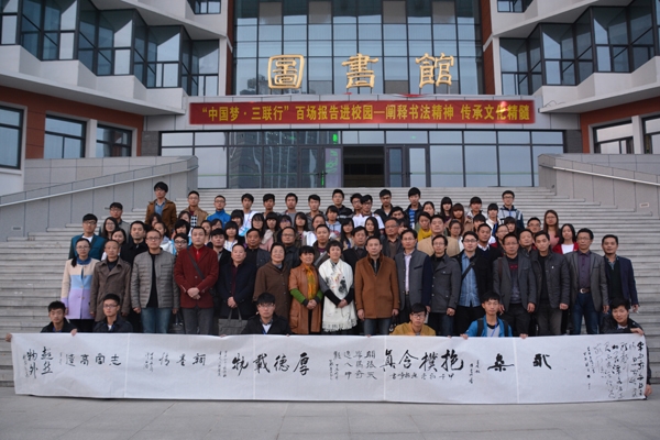 11月20日下午,由中国书法家协会会员、安徽百强书法家廖圣明老师和安徽书法家网公益教学团教授—蒋奎主讲的“中国梦 三联行”百场报告进校园—阐释书法精神,传承文化精髓的专题报告会在我校图书馆学术报告厅隆重举行。安徽省女书法家协会副主席张维瑛、合肥市女书法家协会主席鲍梅峥、安徽书法家网站长李浩以及从省外河南,江苏,省内亳州、阜阳、黄山、蚌埠等地赶来的50余位书法家出席此次报告会。