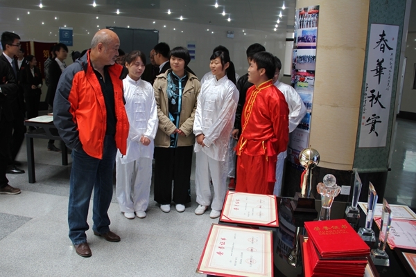 在观摩中华武术表演时,金会庆校长同表演的同学们亲切交谈,首先对同学们的精彩表演给予了充分肯定,询问了加入社团的初衷和练武情况。