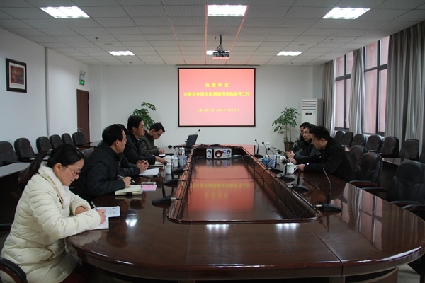 姜发根副校长代表学校对合肥市外国专家局领导一行的到来表示热烈欢迎,对他们一贯支持我校发展表示衷心感谢,同时介绍了我校的发展历程、中外合作办学、外事工作等情况,并就我校近几年外教的聘请、日常教学与生活管理等情况作了详细汇报。