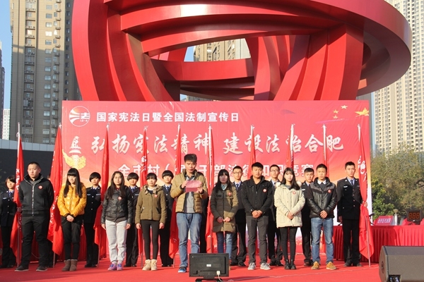 在首个国家宪法日暨第十四个全国法制宣传日来临之际,由合肥市普法办举办的合肥市高校普法志愿者联盟授旗仪式于12月4日上午在和平广场举行,来自我校和安徽大学、合肥工业大学等九所高校的大学生法学社团参加了此次授旗仪式。合肥市司法局刘晓文局长向安徽省青少年法律志愿者服务中心成员、我校大学生法学社社长张成同学授旗。
