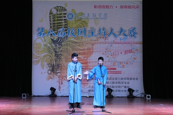 12月19号晚,安徽三联学院第八届校园主持人大赛在图书馆多功能厅圆满落下帷幕,大赛以“梦·起航”为主题,展现了我校学子追梦之路的拼搏精神。本次大赛特邀合肥广播电视台副台长、合肥电视艺术家协会副主席曹亦农、安徽省学生联合会驻会主席姜永俊等担任评委,校领导鲁先长、王瑞友、姜发根及二级学院党总支书记、团总支书记、各学生组织骨干代表参加了本次活动。