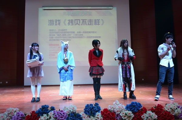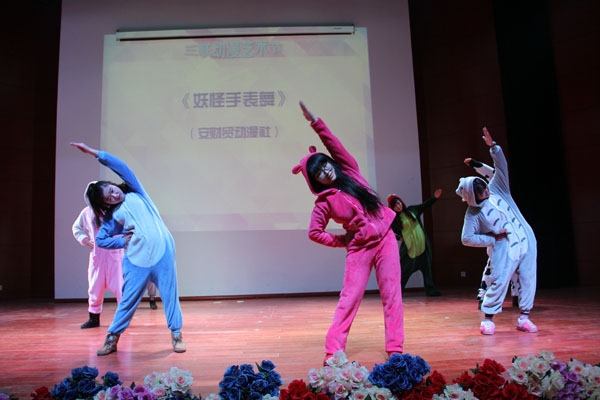 由安徽三联学院日语爱好者协会动漫部带来的开场舞《Beginner》揭开了本次演出的序幕,由合肥ANT动漫社带来的舞蹈、潇然带来的歌曲《宿命》、五木带来的歌曲《文乃的幸福理论》等节目赢得了观众的阵阵掌声,充分表现了当代大学生的青春风采,安财贸动漫社倾情助阵的妖怪手表舞表演为活动气氛更添浓郁。