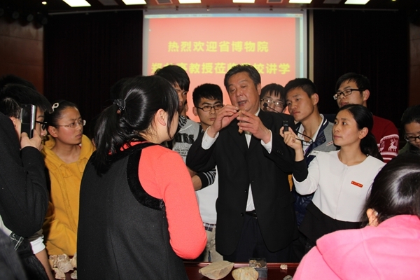 郑院长全面系统地介绍了人类起源的相关理论知识,并结合自己多年来的考古经验,重点介绍了繁昌人字洞遗址的发现与研究,展示了大量繁昌人字洞发掘的现场照片,并不时走下讲台,拿起化石和标本作详细讲解,学生们在感受人类起源文化魅力的同时也被郑院长认真严谨、坚持不懈的工作作风和态度所折服,现场掌声不断,气氛高涨。讲座结束后,郑院长邀请了老师学生观看这些化石和标本,早已激动不已的学生们快速围拢上来,一睹这些从历史深处走来的“珍宝”。讲座在学生们高涨的兴趣和热烈的掌声中圆满落幕。