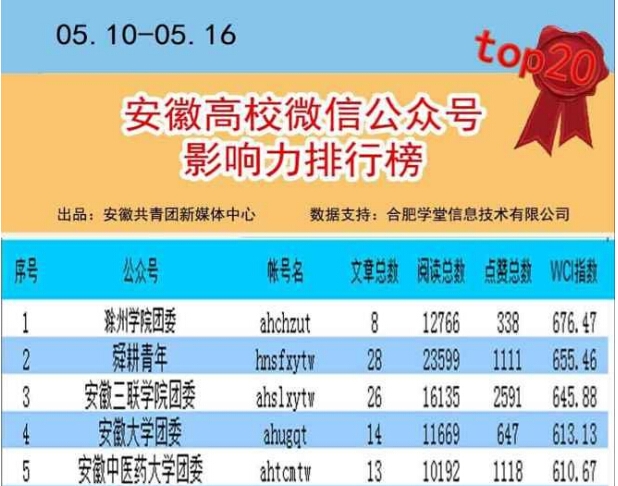 5月18日,我校团委微信公众账号在安徽高校微信账号影响力排行榜单上勇夺前三,这是我校微信新媒体工作取得的最好成绩。其中,《安徽三联学院校长金会庆教授学术讲座》、《中国梦 创业行 安徽青年在行动之创业大讲堂》、《我校隆重举行党员示范岗、党员示范宿舍授牌仪式》等6篇文章荣登安徽高校微信公众号阅读量排行榜前20位,是安徽省高校中上榜文章数最多的高校。
