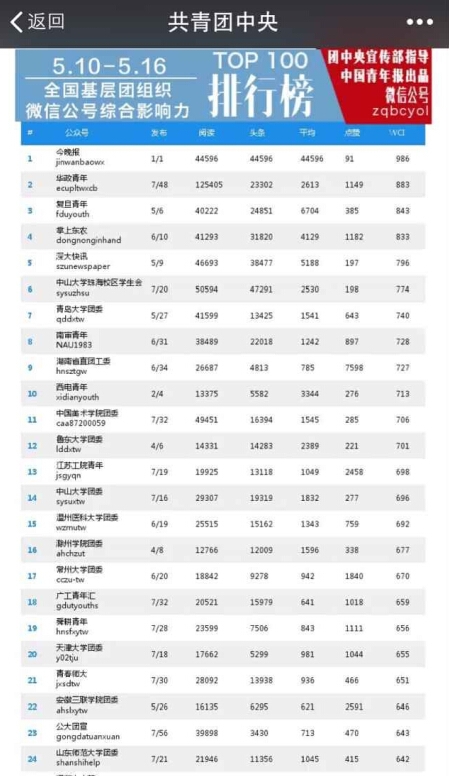 5月19日,我校团委微信公众账号在团中央全国基层团组织微信公号综合影响力排行top100榜单上排名22,这是我省民办高校第一次在团中央微信排行中榜上有名。