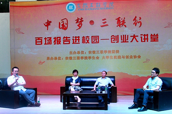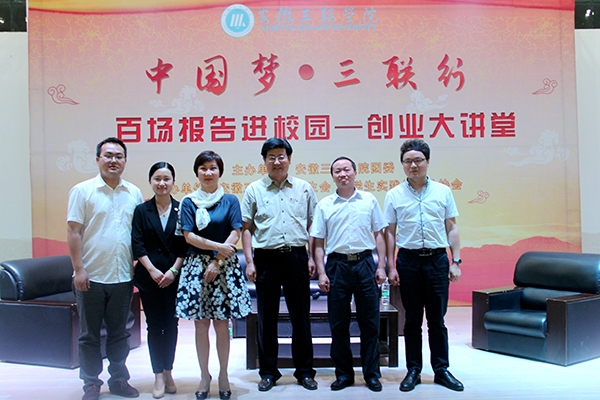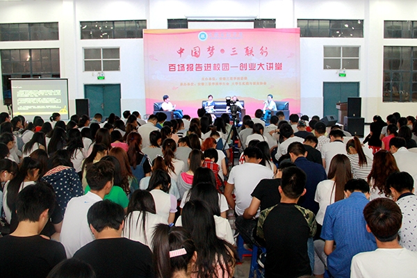 5月26日晚,由共青团安徽三联学院委员会主办,安徽三联学院学生会、大学生实践与创业协会共同承办的中国梦•三联行暨安徽三联学院创业大讲堂在我校大学生活动中心隆重举行。此次讲座的主讲人分别是:安徽国泰房地产开发有限责任公司董事长郑立,多易善社区执行总裁方文超,海盛商贸有限公司总裁蔡金涛,以及白马电商集团副总裁、省网商协会执行秘书长、优秀校友李军。校党委副书记鲁先长,校团委、就业创业处负责人,各二级学院团总支书记及师生共500余人参加了此次创业大讲堂。