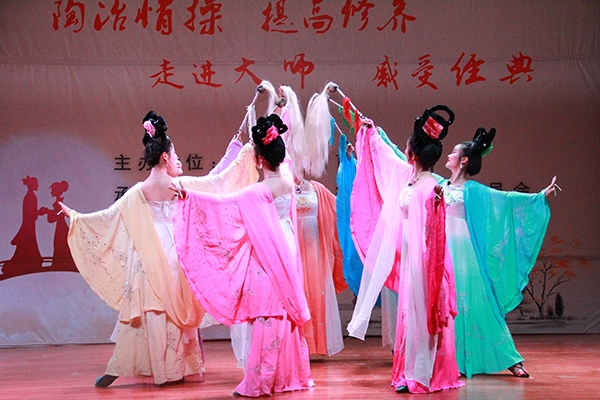 活动伊始,一曲广受人们喜爱的黄梅戏《天仙配·鹊桥》将观众拉进黄梅戏的艺术氛围,七位美丽的仙女通过优美的唱腔将渔樵耕读等人间事物进行了精彩的描述,赢得观众们的热烈掌声。演出主要以黄梅戏和折子戏为主,有感人肺腑的《三两劝廉》,扣人心弦的故事情节引人深省。《天仙配·路遇》情节令人回味无穷。折子戏《沈氏训夫》风格轻快活泼,令人捧腹大笑,将整场演出推向高潮。《戏牡丹》生动幽默,经久流传。最后一支独具传统艺术魅力的舞蹈《袖舞翩跹》将演出带入尾声。