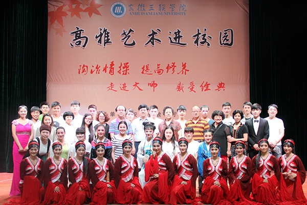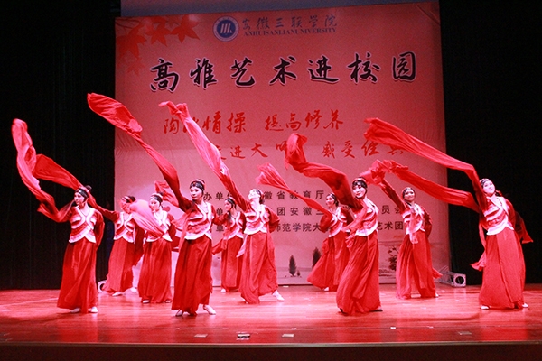 为推动徽文化在高校的传播及普及,倡导和谐文明新校风,陶冶情操,提高修养,走进大师,感受经典,6月3日晚,由安徽省教育厅主办,共青团安徽三联学院委员会承办的高雅艺术进校园—安徽三联学院专场演出在我校图书馆多功能报告厅隆重举行。莅临本次演出的领导和嘉宾有校党委副书记鲁先长、副校长曹艳平、校工会主席王坚伟、安庆师范学院音乐学院院长荀安华及校团委、艺术学院负责人、二级学院分管副院长等。此次活动的演出单位是来自安庆师范学院大学生黄梅戏艺术团。