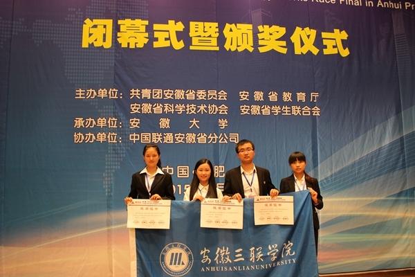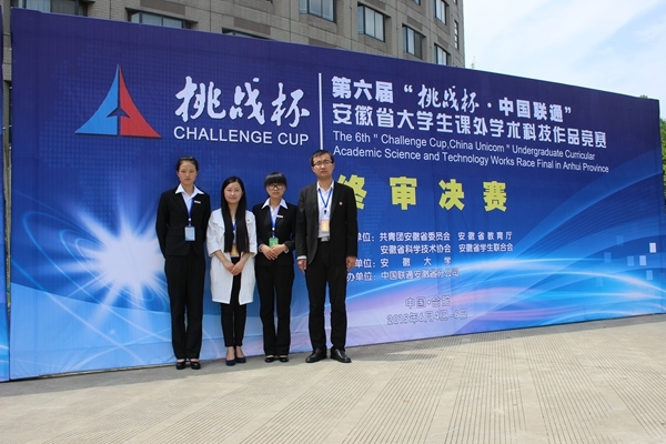 2015年第六届“挑战杯·中国联通”安徽省大学生课外学术科技作品竞赛终审决赛于6月4日—6月6日在安徽大学隆重举行。本次活动由共青团安徽省委员会、安徽省教育厅、安徽省科学技术协会、安徽省学生联合会主办,安徽大学承办。我校团委副书记李燕带队、商学院指导教师李源晖与学生一同参加了此次大赛。