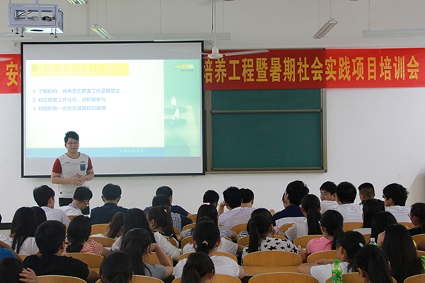 为丰富大学生暑期生活,引领广大青年学生开展实践服务活动。近日,我校举办2015年青年志愿者培训工程暨暑期社会实践项目培训会。此次活动邀请到杰出校友、第六批国家级爱心大使、格桑花安徽省高校工作站副理事长、联合国儿童基金会青少年预防艾滋病爱心大使年昶青主讲。我校青年志愿者服务中心骨干、社团代表等参加了此次培训。