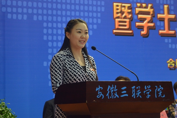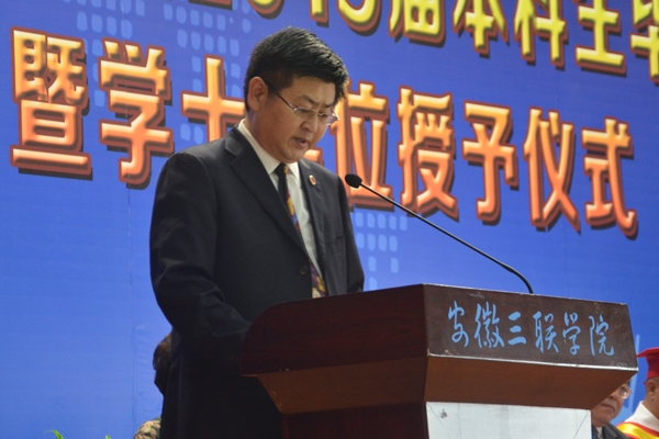 金会庆校长在典礼上作了以“奔跑吧,三联学子”为主题的毕业致辞,金校长代表学校向2015届全体毕业生表示祝贺,他与大家共同回忆了大学四年来学校的快速发展和同学们的成长进步。同时,在即将离校的时刻,金会庆校长希望毕业对同学们是下一个新旅程的开始,嘱托全体毕业同学朝着新的人生目标奔跑,寄语同学们要“胸怀梦想”奔跑;要“肩负责任”奔跑;要“带上坚持”奔跑。最后,金校长动情的表示三联学院永远是同学们的家,祝福同学们勇敢的开拓属于自己的天与地,用自己的青春和奋斗书写三联学子辉煌灿烂的明天。对金会庆校长饱含深情的毕业致辞同学们报以热烈的掌声。
