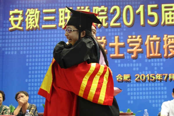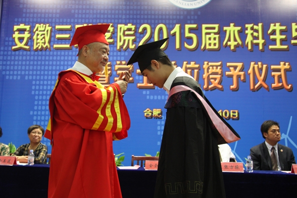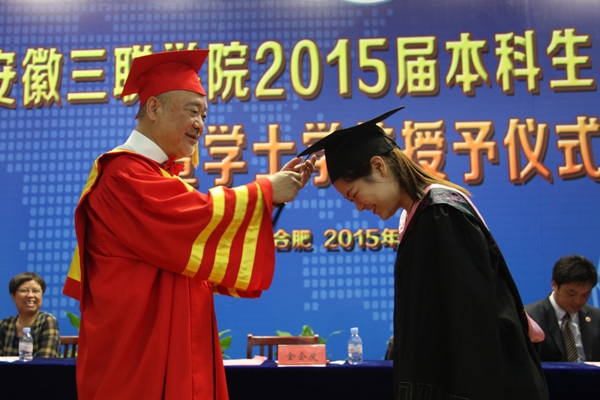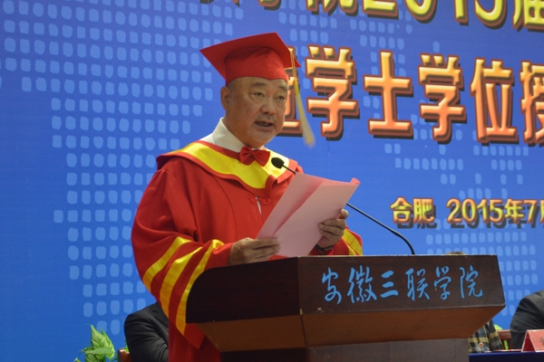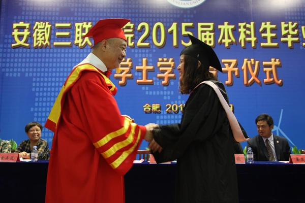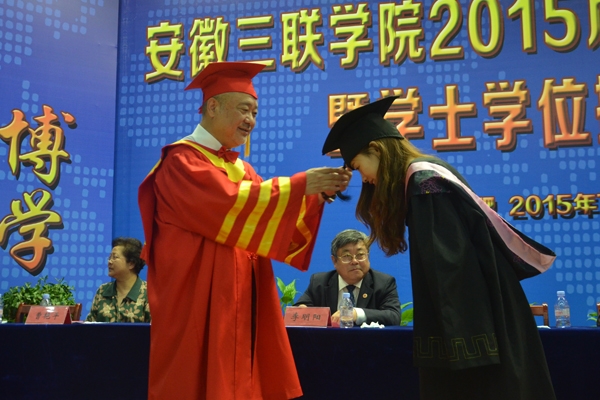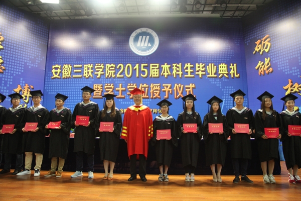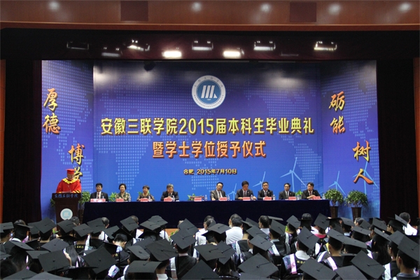 红果飘香盈满枝,满园桃李竞芬芳,又到一年毕业时。7月10日,安徽三联学院2015届本科生毕业典礼暨学士学位授予仪式在图书馆多功能厅隆重举行。校长、校学位评定委员会主席金会庆教授,三联集团董事长张方振教授,校党政领导李明阳、姜发根、金美莲、秦永元、曹艳平、王瑞友、金哲,以及各二级单位负责人出席典礼。安徽三联学院2015届近两千名本科毕业生身着学位服,与学院领导、老师、家人一同见证了人生中这一重要时刻。典礼由校党委副书记鲁先长主持。