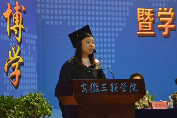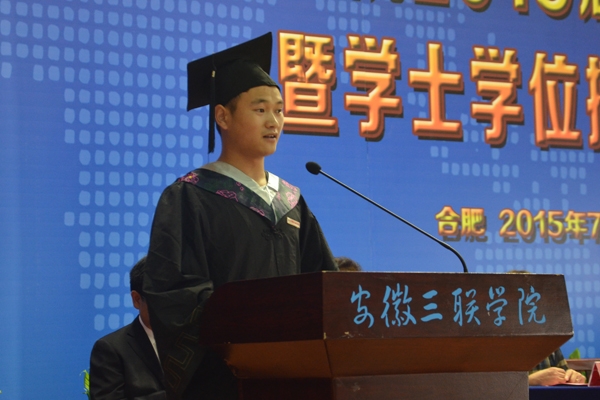 经济学院黄雨薇同学及电子电气工程学院潘子建同学代表全体毕业生发言,两位同学在发言中表示,四年的大学生活是最美好的回忆,在三联学院的所有记忆都铭记于心,在未来,一定会牢记“厚德博学,砺能树人”的校训,踏踏实实做人,认认真真工作,迎接社会的挑战,为理想奋斗,为母校争光。