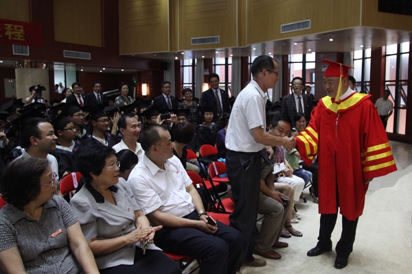 在庄严的国歌和校歌声中,本届毕业典礼正式拉开帷幕。金会庆校长身着红色导师服,为毕业生代表颁发毕业证书,为每一位毕业生扶正流苏。