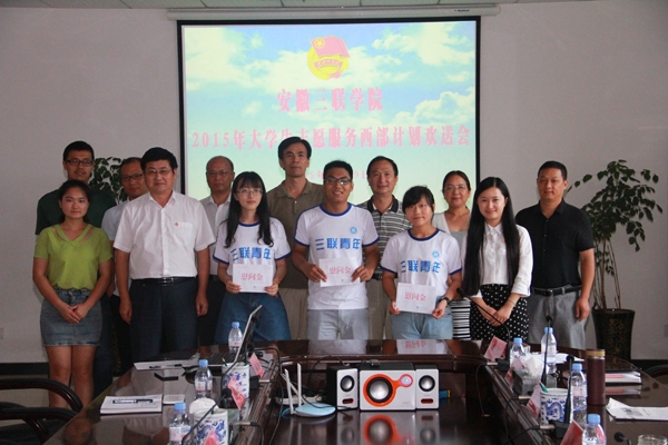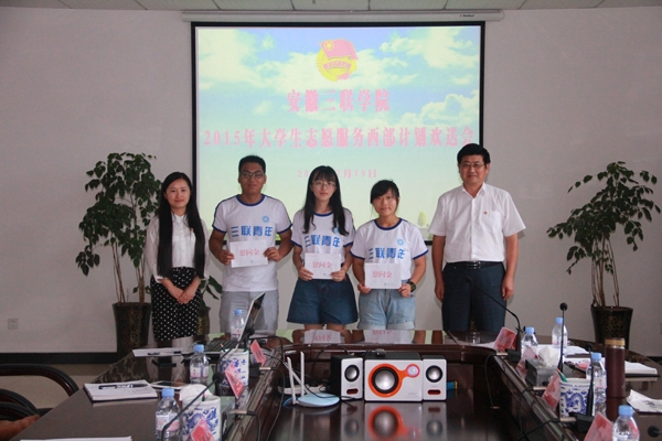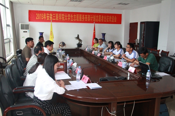 7月19日下午,2015年大学生志愿服务西部计划志愿者出征欢送会在T518会议室举行。校党委副书记鲁先长,学生处、就业实训处、团委负责人,交通工程学院、艺术学院、外语学院党团总支书记、辅导员及2015年入选的西部志愿者参加了欢送会。欢送会由校团委负责人李燕主持。