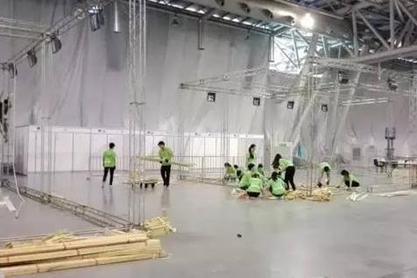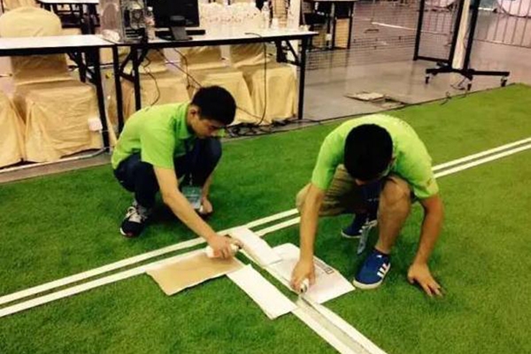我校志愿者主要负责类人组与小型组区域的赛事准备与服务。在为期一周的赛前准备活动中,我校志愿者不怕苦不怕累,从初始的会展布置开始,陆续完成桌椅摆放,足球场画线喷漆,球门加固,观众栏杆围拉等工作。