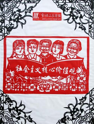 近日,在安徽共青团的官方微信平台上头版推送了这样一条消息:【创意】剪纸还能这么玩?快看三联学院诚意作品。原来是团省委宣传部全面报道了我校剪纸协会剪出的社会主义核心价值观,这幅作品是传统艺术与现代创意的完美结合体,在这个”脑洞大开“的互联网时代,如此文艺清新的作品一发布,迅速吸引了朋友圈的了众多关注和点赞,小伙伴们纷纷@安徽三联学院团委,表示要来我校学习剪纸,丰富课余生活。
