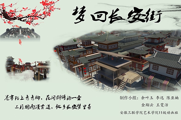 今年为我校艺术学院第二次组队参加该大赛,经过省预赛、复赛和国赛预评、复评成功进入总决赛。在校领导、校团委、艺术学院的关心指导下,艺术学院林亚杰、陶宗华老师指导的2011级动画本科专业金翔云同学代表本组5位同学参加了总决赛,通过与国内100多所高校选送的400余件作品进行激烈角逐,我校的三维建筑漫游作品《梦回长安街》获得数字媒体设计类——中华民族文化组三等奖。