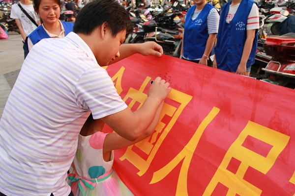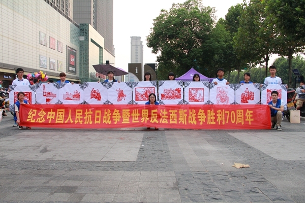 下午,青年志愿者中心和剪纸协会的同学们前往明珠广场、中环城等大型广场处开展“抗日战争胜利70周年” 主题剪纸作品展和爱国签名活动,旨在让更多的民众了解到抗日战争胜利的意义及爱国主义精神的重要性,有不少民众驻足欣赏剪纸作品,在了解活动意义后对我校青年志愿者和剪纸协会制作的主题剪纸作品连连称赞,高度肯定了我校学子在此次活动中付出的努力和汗水。