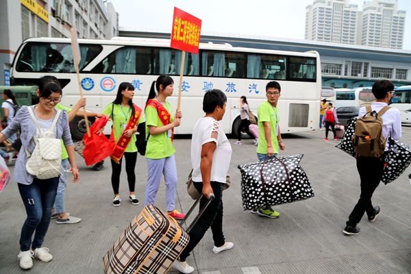 伴随着清晨的第一缕阳光,身穿青绿色T恤衫(“小青葱”)的志愿者随车来到车站。在川流不息的客流里,志愿者一边高举“安徽三联学院接站点”的牌子一边高喊“三联的,在这里”,一边帮助新生及家长拿行李并带到指定位置等待校车接应。来自经济管理学院物流管理专业的新生家长说:“非常感谢这些志愿者的帮助,有了他们,一路上少了许多麻烦”。