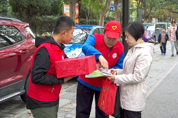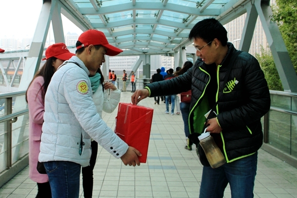 我校青年志愿者前往明珠广场和万达广场进行流动式募捐活动。来自我校护理学院的志愿者时梦芸表示:“我们是第一次参与这种募捐活动,很期待也很紧张。”但由于天气原因,温度很低,风雨交加,行人都忙于赶路,给此次募捐活动增加了难度。我校志愿者不畏缩、迎难而上,一次次向行人介绍春蕾计划。在志愿者们的不懈努力下,募捐活动得以顺利开展。其中,令人印象最深刻的募捐者是在安徽省图书馆门前遇到的一对母女,两人主动走向志愿者询问情况,在了解活动意义后,母亲把钱放到小女孩的手里,告诉她“要有爱心”,然后让孩子把钱塞到爱心箱里。当时抱着爱心箱的志愿者何盼笑着说:“今天真正体验到了志愿活动带给人的快乐。”何盼脸上带着满足的笑,刚刚被拒绝时的阴霾也一扫而光。