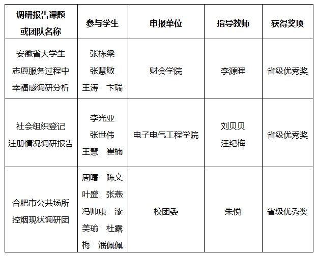 在以“践行‘八字真经’ 投身‘四个全面’”为主题的2015年 “三下乡”社会实践活动中,我校申报的《赴阜阳民间公益组织政策法律调研报告》、《安徽省大学生志愿服务过程中幸福感调研分析》获评优秀调研报告;“合肥市公共场所控烟现状调研团”获评优秀团队。