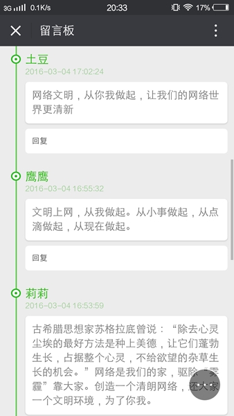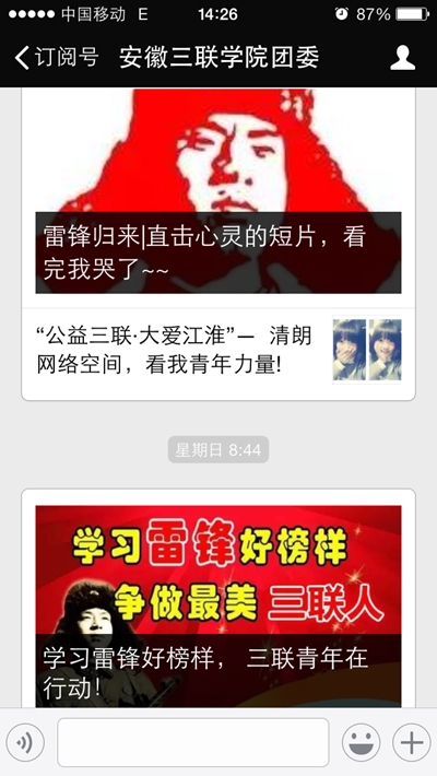 为抓住青年需求,扩大雷锋日活动的参与面,校团委结合实际,充分发挥新媒体平台的优势和便利,利用多种形式与青年互动交流。率先转发团省委发起的“听志愿者说”大型线上志愿接力活动,校党委副书记带头转发到微信朋友圈开展线上志愿接力,全校主要学生干部纷纷响应。微信平台分享的雷锋短片和发起的“清朗网络 青年力量”线上活动,第一时间吸引700余名网络文明志愿者跟帖,同学们纷纷在微信平台的留言板上写下自己对雷锋精神的认识,表达他们对共创清朗网络的决心,树立了我校青年志愿者的文明新风范。自2015年我校在省内高校率先发起“清朗网络 青年力量”网络文明志愿服务活动以来,形成了从核心到外围的网络文明志愿者6000余名,在网上积极发出青年好声音,形成强劲青春正能量。