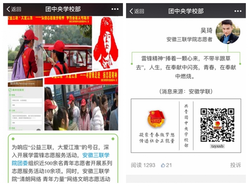 2016年3月5日,是毛泽东同志题词“向雷锋同志学习”53周年纪念日,也是第17个“中国青年志愿者服务日”,为积极响应“公益三联 大爱江淮”号召,大力弘扬雷锋精神,提升我校学子的社会责任感,校团委组织近500余名青年志愿者开展了各类线上线下志愿服务活动10余项。由于活动形式新颖、内容丰富,参与面广、参与度高,团中央学校部、全国学联、安徽学联官方微信、安徽新闻联播均报道了我校志愿服务活动相关情况。