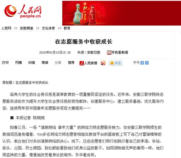 3月15日,安徽日报教育时空专栏中,以《在志愿服务中收获成长》为题,对我校将志愿服务活动作为提升大学生社会责任感的有效载体,创建服务中心,建立服务基地,优化服务内容,并连续两年获评中国青年志愿服务项目大赛银奖的主要情况,进行了全面报道,随后人民网等多家媒体纷纷转载。