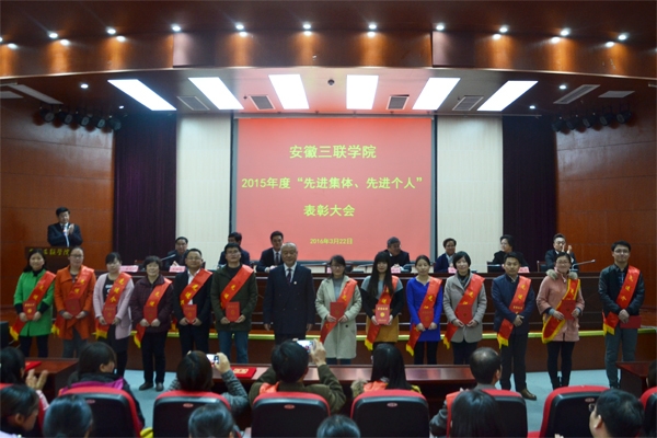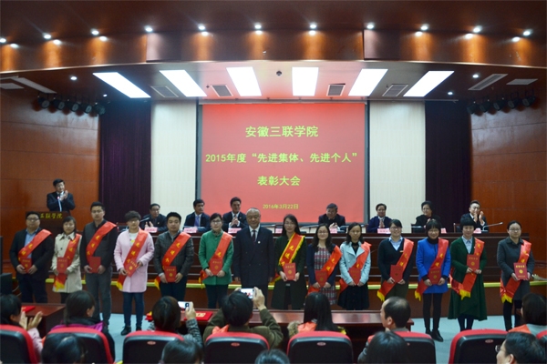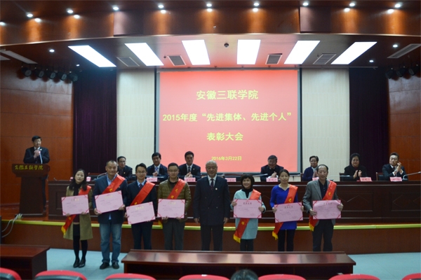 3月22日,安徽三联学院2015年度“先进集体、先进个人”表彰大会在图书馆学术报告厅隆重举行。校长金会庆教授,省教育督导专员、校党委书记李明阳同志,在肥校党政领导,各单位负责人、副科级及以上管理人员,受表彰人员以及各二级学院教师、辅导员代表参加大会,会议由校党委副书记鲁先长主持。