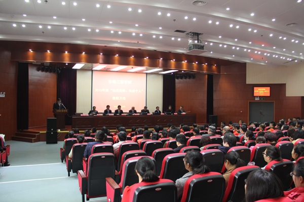大会在庄严的国歌、校歌声中拉开帷幕。校党委书记李明阳,副校长姜发根、王瑞友分别宣读了表彰文件。大会共表彰2015年度先进集体7个、先进个人57名,扁平化管理优秀单位3个;年度创建“平安校园”先进集体6个、先进个人15名;年度就业工作先进集体4个、先进个人14名;年度新闻工作宣传先进集体3个、先进个人5名;年度先进团总支3个、社会实践先进集体3个、社会实践优秀指导教师10名,金会庆校长向受表彰单位及个人颁发荣誉证书。先进个人代表基础部教师张纪强、先进集体代表教务处处长蔡文芬分别上台发言。