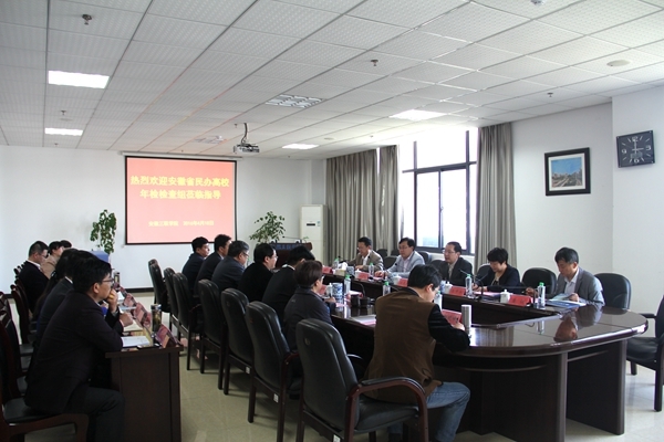 4月18日,以安徽省民办教育协会会长、安徽农业大学督导员赵良庆为组长,安徽大学艺术与传媒学院教学部主任吕中华、巢湖学院财务处处长王万海、池州职业技术学院教学督导董俊以及安徽省教育厅民办教育处主任科员韩传宇组成的省民办高校年检检查组莅临我校,开展2015年度检查工作。汇报会在T518会议室举行,学校董事长余皖生,校党政领导李明阳、鲁先长、姜发根、金美莲、秦永元、操晓峰及党办、综合办、教务处、人事处、师资处、财务处、学生处等部门负责人参加会议。