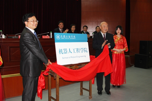 在欢快的音乐声中,省经济和信息化委员会潘峰处长和安徽三联学院校长金会庆教授共同为机器人工程学院揭牌。